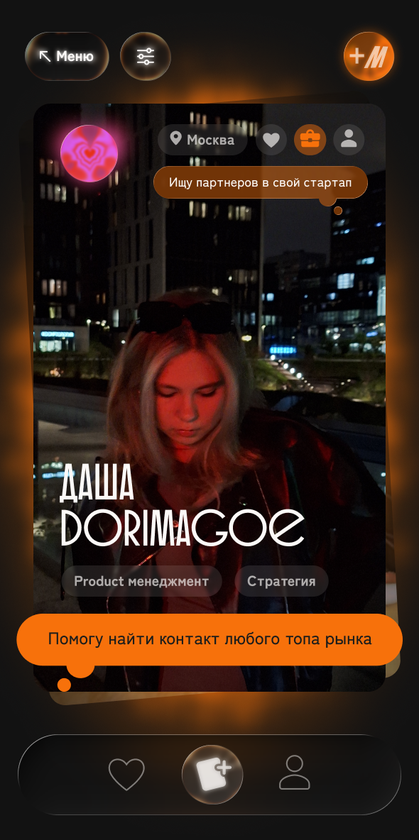 Алгоритм подбора партнеров основан не на внешности, а на профилях бизнеса: сфера, стадия проекта, потребности (инвестиции, экспертиза, кофаундер). Реализована система взаимных лайков с мгновенным открытием чата при совпадении. Фильтры по геолокации, выручке, количеству сотрудников и роли (основатель, топ-менеджер, инвестор).